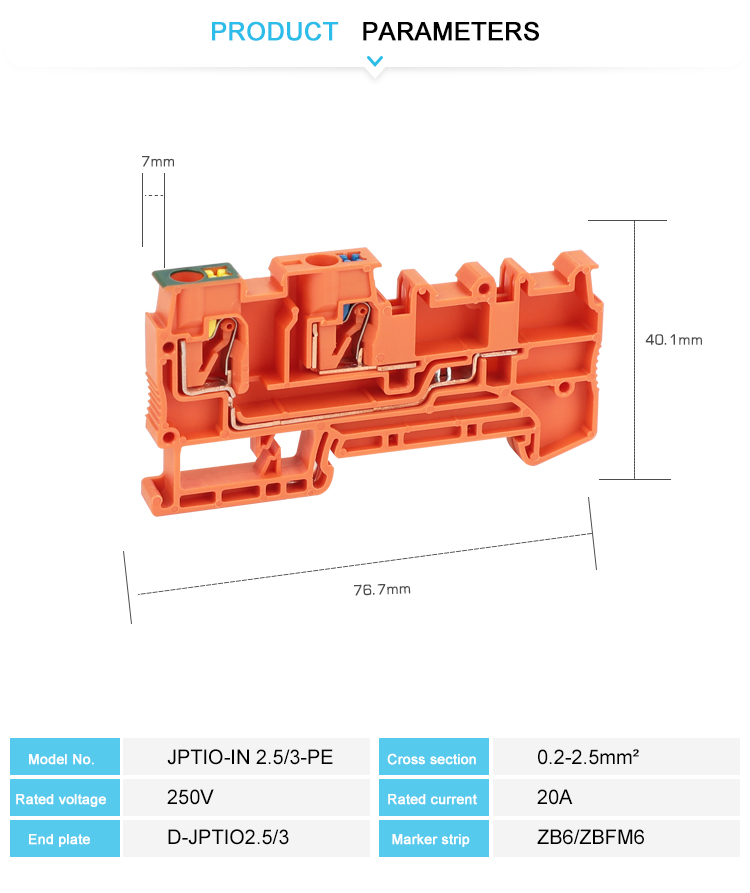 Ang teknolohiyang direktang koneksyon ng push-in ay ginagawang mga pwersa ng pagpasok na nabawasan ng hanggang sa 50 porsyento at mga kable na walang tool, paganahin ang mga conductor na madaling maipasok at direkta. Ginawa mula sa engineering flame retardants nylon pa66 na may tanso na screw metal.made mula sa engineering flame retardants nylon pa66 na may tanso na tornilyo metal.Ang mga push-in na mga bloke ng terminal koneksyon.with Universal Foot na maaaring mai -install sa DIN Rail NS 35. Ito ay maaaring kumonekta sa dalawang conductor nang madali, kahit na ang mga malalaking seksyon ng cross conductor ay hindi isang problema.Electric potensyal na pamamahagi ay maaaring gumamit ng mga nakapirming tulay sa terminal center.All type of accessories: end cover, end stopper, partition plate, marker trip, nakapirming tulay, insertion bridge, atbp.