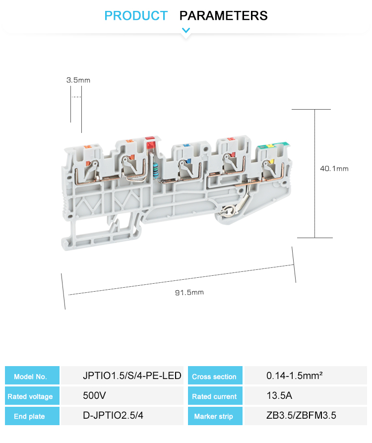 Ginawa mula sa engineering flame retardants nylon pa66 na may tanso na screw metal.made mula sa engineering flame retardants nylon pa66 na may tanso na tornilyo metal.Ang mga push-in na mga bloke ng terminal koneksyon.with Universal Foot na maaaring mai -install sa DIN Rail NS 35. Ito ay maaaring kumonekta sa dalawang conductor nang madali, kahit na ang mga malalaking seksyon ng cross conductor ay hindi isang problema.Electric potensyal na pamamahagi ay maaaring gumamit ng mga nakapirming tulay sa terminal center.All type of accessories: end cover, end stopper, partition plate, marker trip, nakapirming tulay, insertion bridge, atbp.
