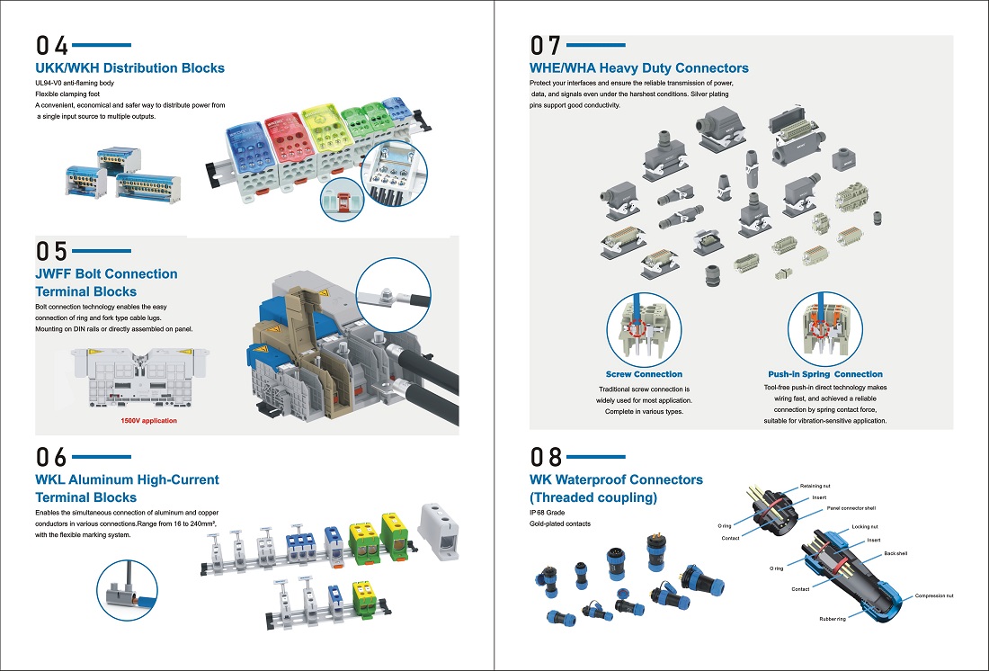 Sa Booth A14, ang WKDQ ay magpapakita ng walong serye ng mga produktong terminal block, kabilang ang Juk, Jut, JPT, JPTV, JST, JPTFix, JPtio, at UKK. Ang mga produktong ito ay umaangkop sa mga senaryo tulad ng kontrol sa industriya, intelihenteng aparato, at bagong enerhiya. Sa mga tampok tulad ng mataas na pagiging maaasahan, resilience ng kapaligiran, at kakayahang umangkop, naghahatid kami ng mga end-to-end na mga solusyon sa koneksyon sa koryente para sa mga pandaigdigang kliyente.