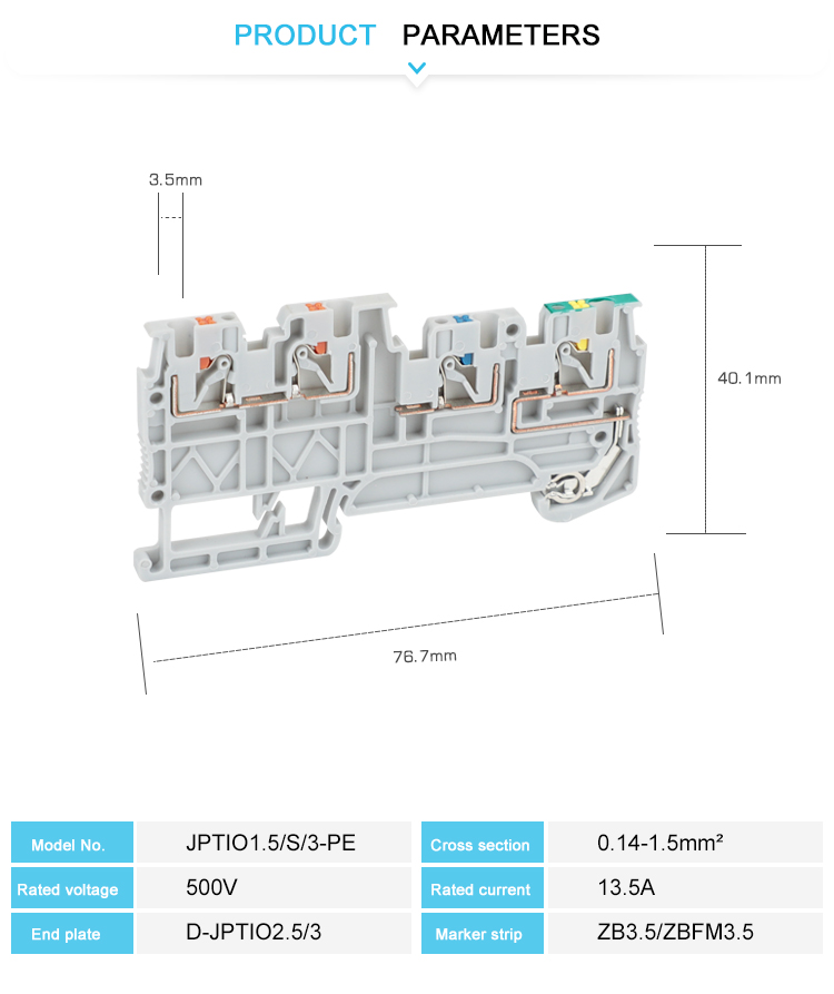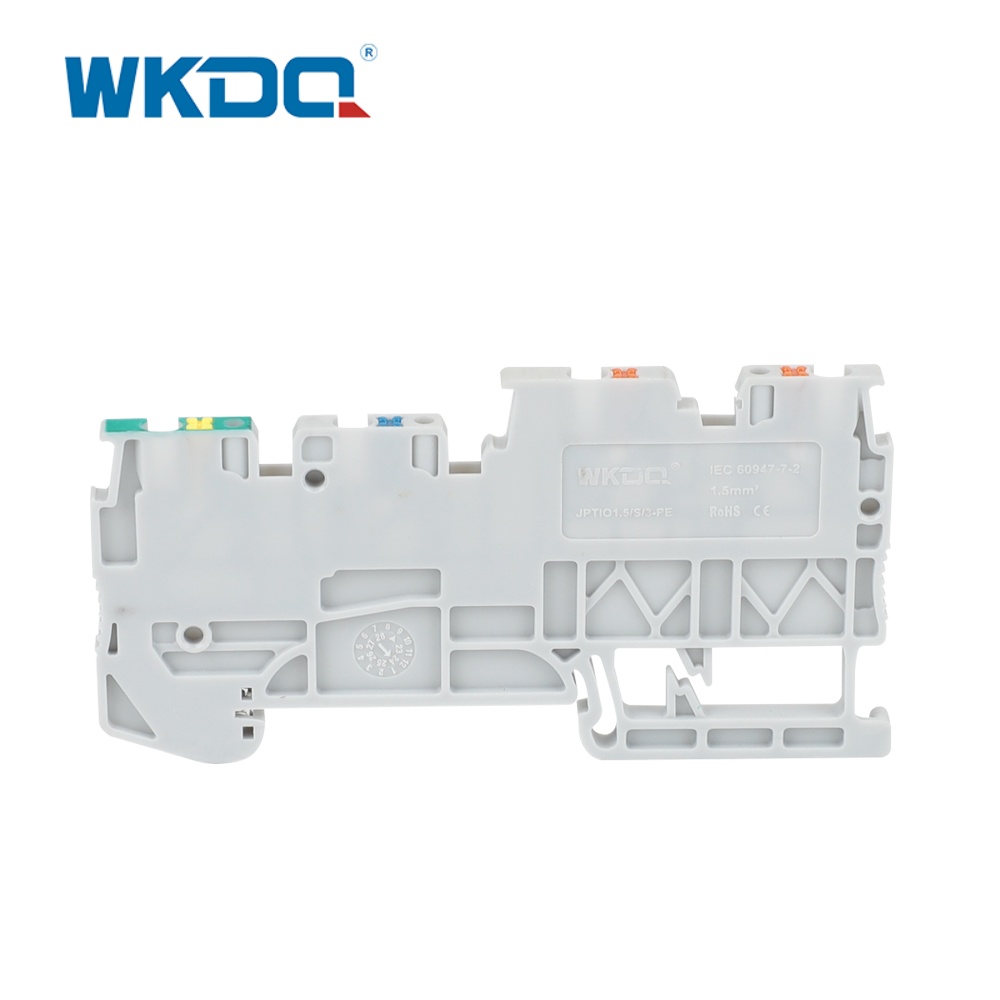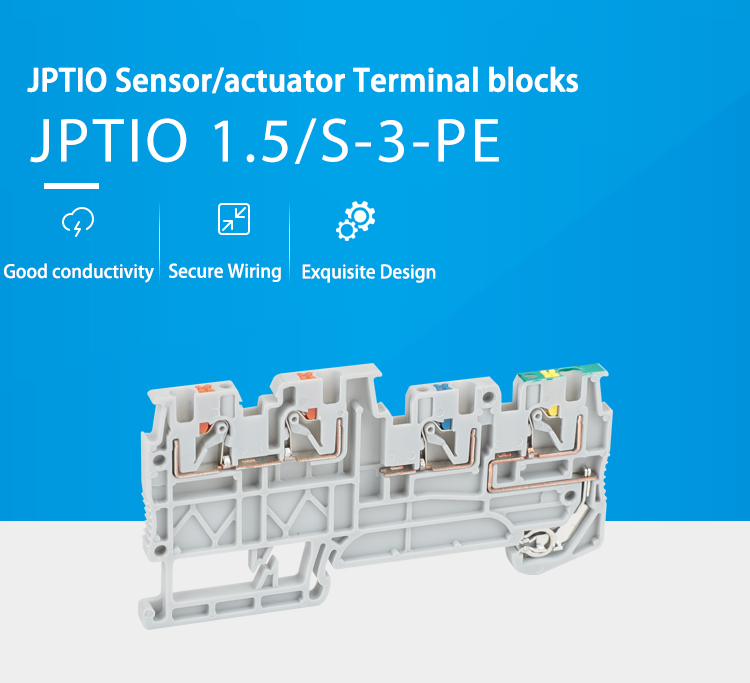 Jptio1.5/s/3-pe terminal block Ang terminal block ay nagpatibay ng apoy-retardant nylon PA66, tanso conductor at hindi kinakalawang na asero compression spring upang matiyak ang kaligtasan ng elektrikal at mekanikal na lakas sa ilalim ng malupit na mga kondisyon sa pagtatrabaho.